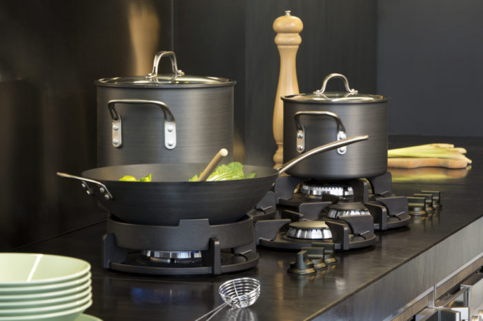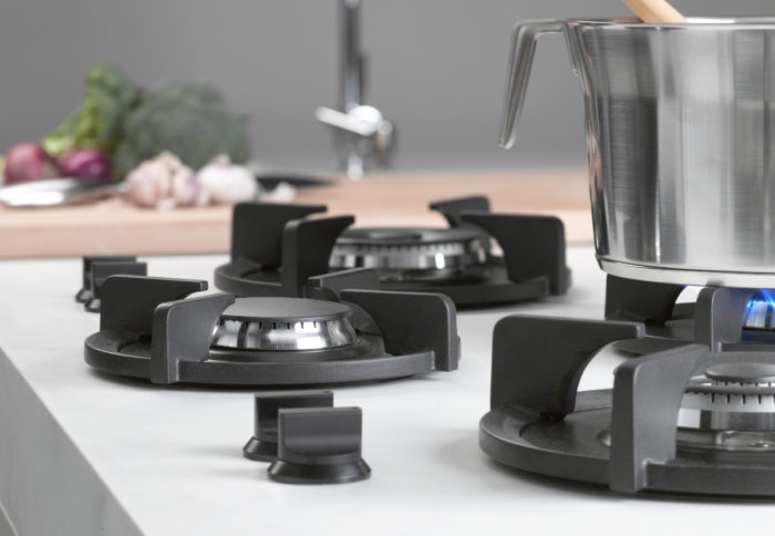 PITT’s sturdy cast-iron pan supports (or brass, if you opt for the professional line) appear to hover over the countertop, creating a clean, distinctive look. The pan supports lift off of the burners for easy cleanup.